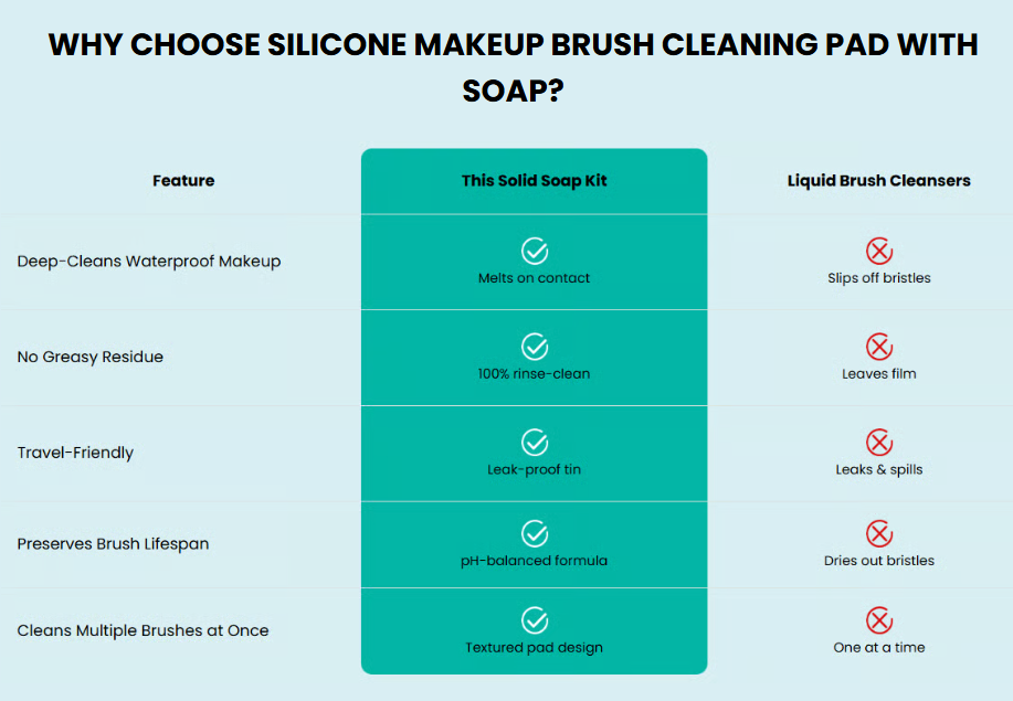 This Silicone Makeup Brush Cleaning Pad with Soap uses a solid-state emulsion that grips the bristles and breaks down makeup on contact—the same way a dry shampoo bar outperforms liquid shampoo. Add the textured silicone pad (heart or moon ridges), and you get micro-friction that lifts stubborn residue from inside the bristles, not just the surface.